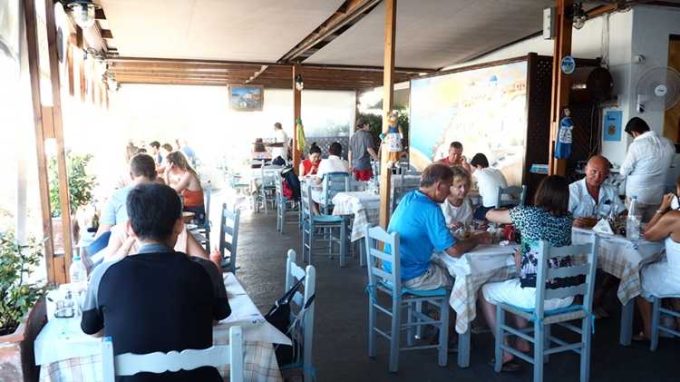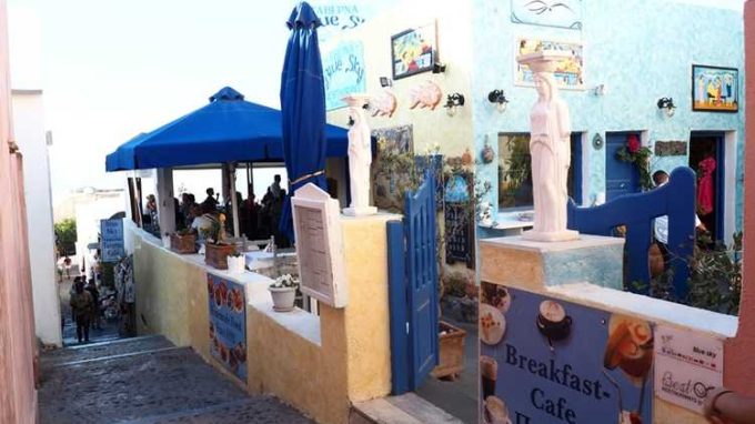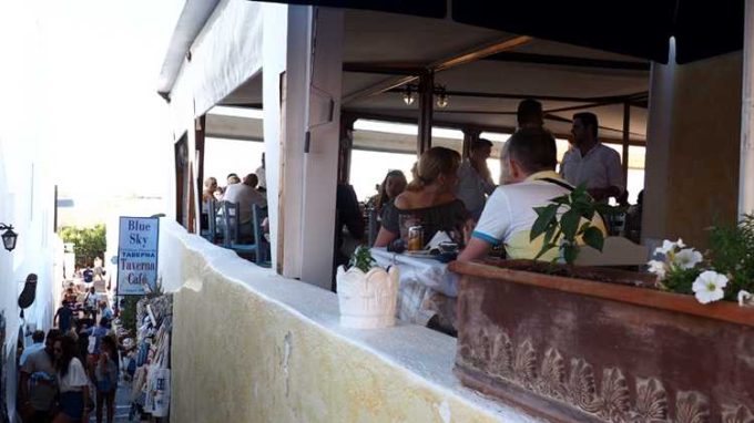 Το κατάστημα λειτουργεί από το πρωί ως αργά το βράδυ και προσφέρει άφθονο σαντορινιό κρασί…