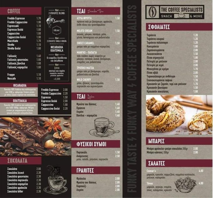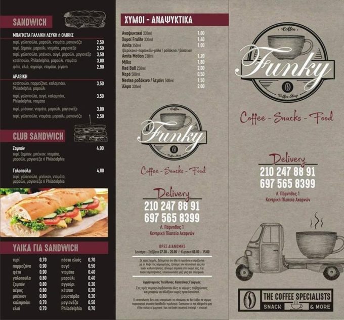 Cafe-tiropites-santouits-funky-coffee-shop-platia-axarnes. Delivery, Καφέ, εσπρέσσο, καπουτσίνο, Ελληνικό, φραπέ, τυρόπιτες, κρουασάν, σαντουίτς κρύα-ζεστά, αναψυκτικά, παγωτά στην πλατεία στο Μενίδι.