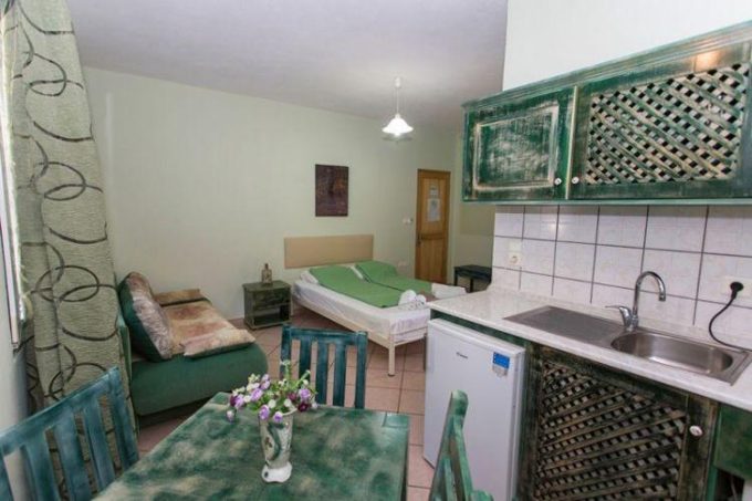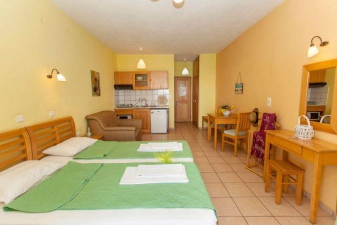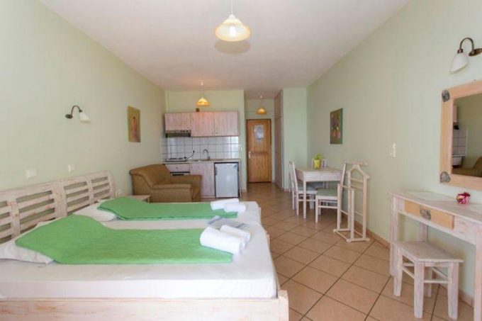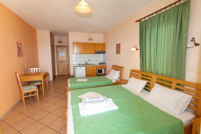 Διαθέτουμε 14 ευρύχωρα δωμάτια, 10 δίκλινα δωμάτια με δυνατότητα να γίνουν τρίκλινα και 4 δίχωρα διαμερίσματα με όλες τις σύγχρονες ανέσεις – εξοπλισμό ( A/C, Τ V, κουζίνα , ψυγείο, μπάνιο).