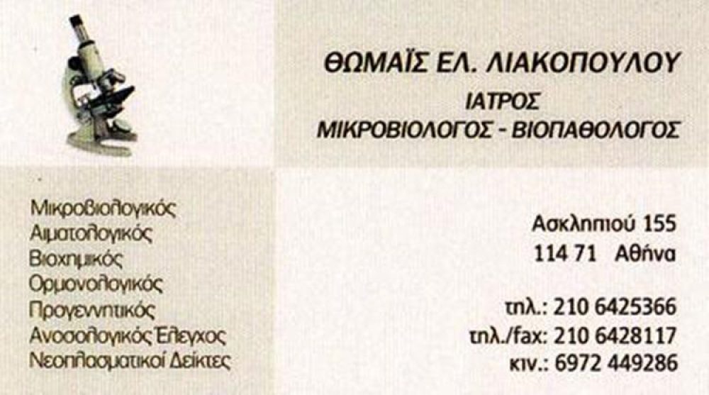 Μικροβιολογικό εργαστήριο Αθήνα, Εξάρχεια, Νεάπολη, Λυκαβηττός Λιακοπούλου Θωμαϊς