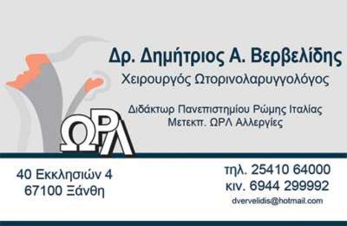 ΒΕΡΒΕΛΙΔΗΣ ΔΗΜΗΤΡΙΟΣ – ΩΤΟΡΙΝΟΛΑΡΥΓΓΟΛΟΓΟΣ ΞΑΝΘΗ – ΔΙΔΑΚΤΩΡ ΠΑΝΕΠΙΣΤΗΜΙΟΥ ΡΩΜΗΣ ΙΤΑΛΙΑΣ – ΩΡΛ ΑΛΛΕΡΓΙΑ – ΕΝΔΟΣΚΟΠΗΣΗ ΛΑΡΥΓΓΟΣ, ΡΙΝΟΣ – ΕΛΕΓΧΟΣ ΙΛΙΓΓΟΥ – ΠΑΙΔΟΩΡΛ – ΩΤΟΠΛΑΣΤΙΚΗ